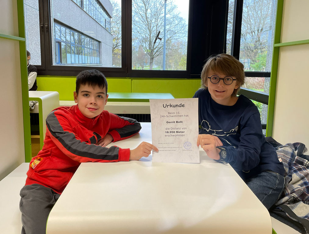 Einen herorragenden dritten Platz unter allen teilnehmenden Schulmannschaften belegten die Schwimmerinnen und Schwimmer des Gymnasiums Spaichingen beim 24-Stunden-Schwimmen im Hallenbad Aldingen. Zwischen Samstag, 9. November, 12 Uhr, und Sonntag, 10. November, 12 Uhr, schwammen Chiara Opinc, Gerrit Bolli, Lena Schwarz, Luke Opinc und Nathan Combeller Arcos insgesamt 53,9 Kilometer. Fleißigster Schwimmer war dabei Gerrit Bolli, der fast 19 Kilometer im Becken zurücklegte, was in etwa der Strecke zwischen Spaichingen und Schwenningen entspricht. Veranstalter war die Deutsche Lebensrettungsgesellschaft (DLRG) Aldingen-Spaichingen.