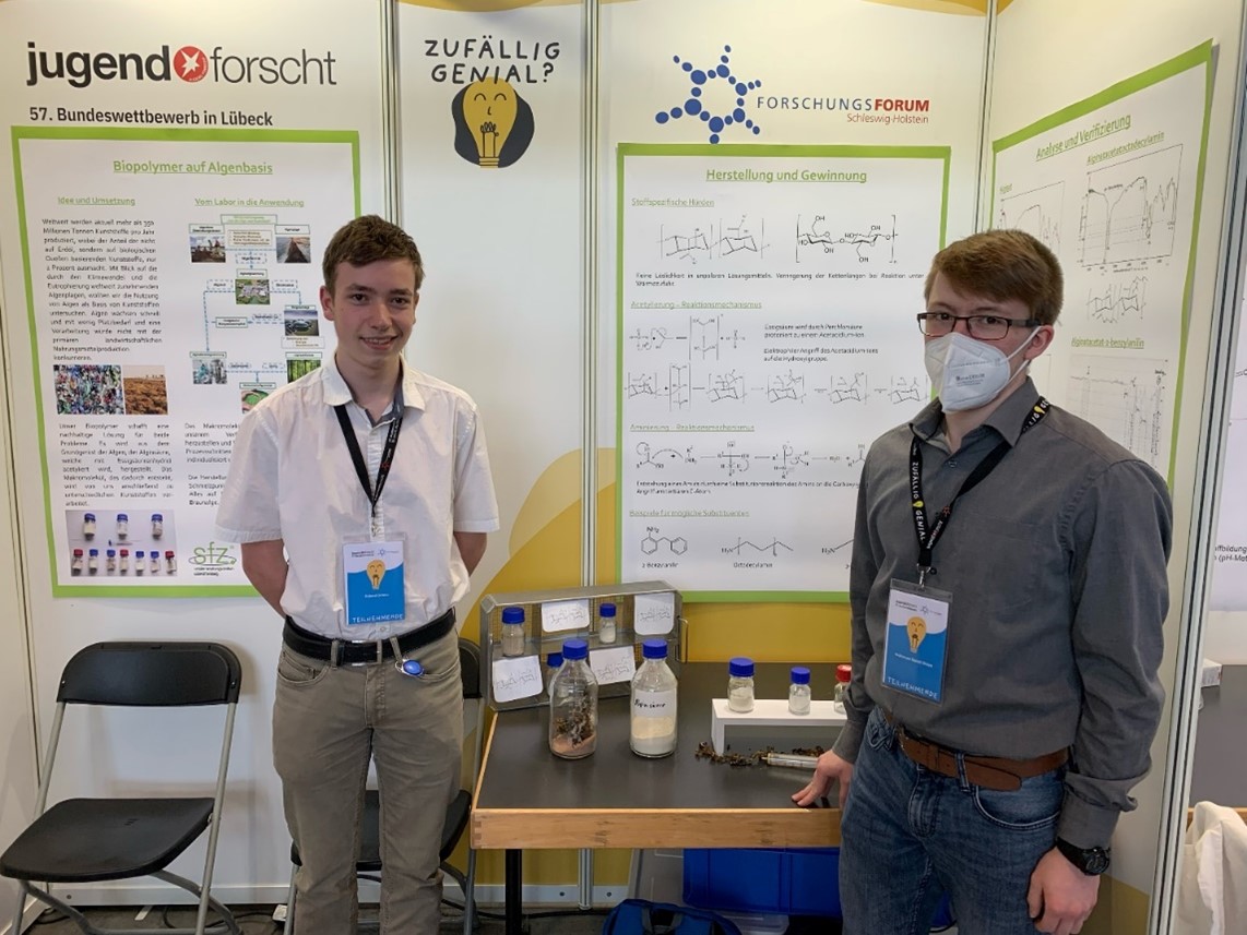 In ihrem Projekt „Biopolymer auf Algenbasis“ haben die beiden siebzehnjährigen Schüler über zwei Jahre hinweg an der Entwicklung eines Kunststoffs auf Basis von Algen geforscht. In dieser Zeit haben sie über viele Etappen hinweg ein Verfahren erarbeitet, welches die Gewinnung eines thermisch verformbaren Kunststoffs auf der Basis von Alginsäure, der Gerüstsubstanz von Algen, ermöglicht. Das Produkt wurde bereits von der Universität Stuttgart verifiziert, stellt eine Alternative zu herkömmlichen Kunststoffen auf Erdölbasis dar und steht, im Vergleich zu anderen Biopolymeren, nicht in Konkurrenz zur Nahrungsmittelproduktion.