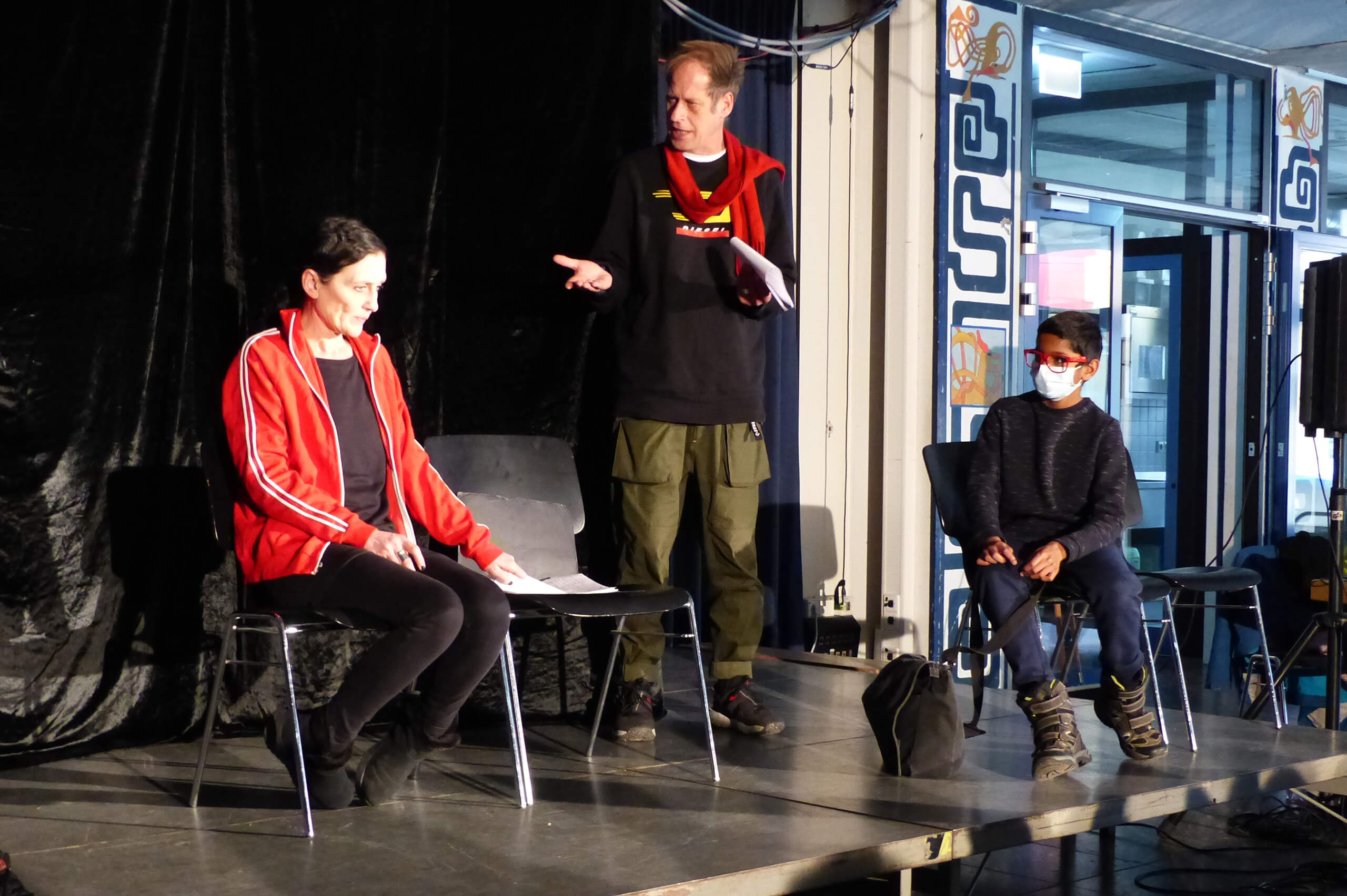 „Welches Verhalten wäre in der Situation richtig?“, fragt Alice Swatoch die Zuschauer. „Zu ihrer Meinung stehen“, „Hilfe holen, sich an Mitschüler, den Sozialarbeiter oder an einen Lehrer wenden“ – sind sich die Schülerinnen und Schüler einig. Im Anschluss finden sie dann Handlungsalternativen, die sie nachspielen dürfen. Wie das dann aussehen kann, präsentiert die Theatergruppe gemeinsam mit den 6. Klässlern.