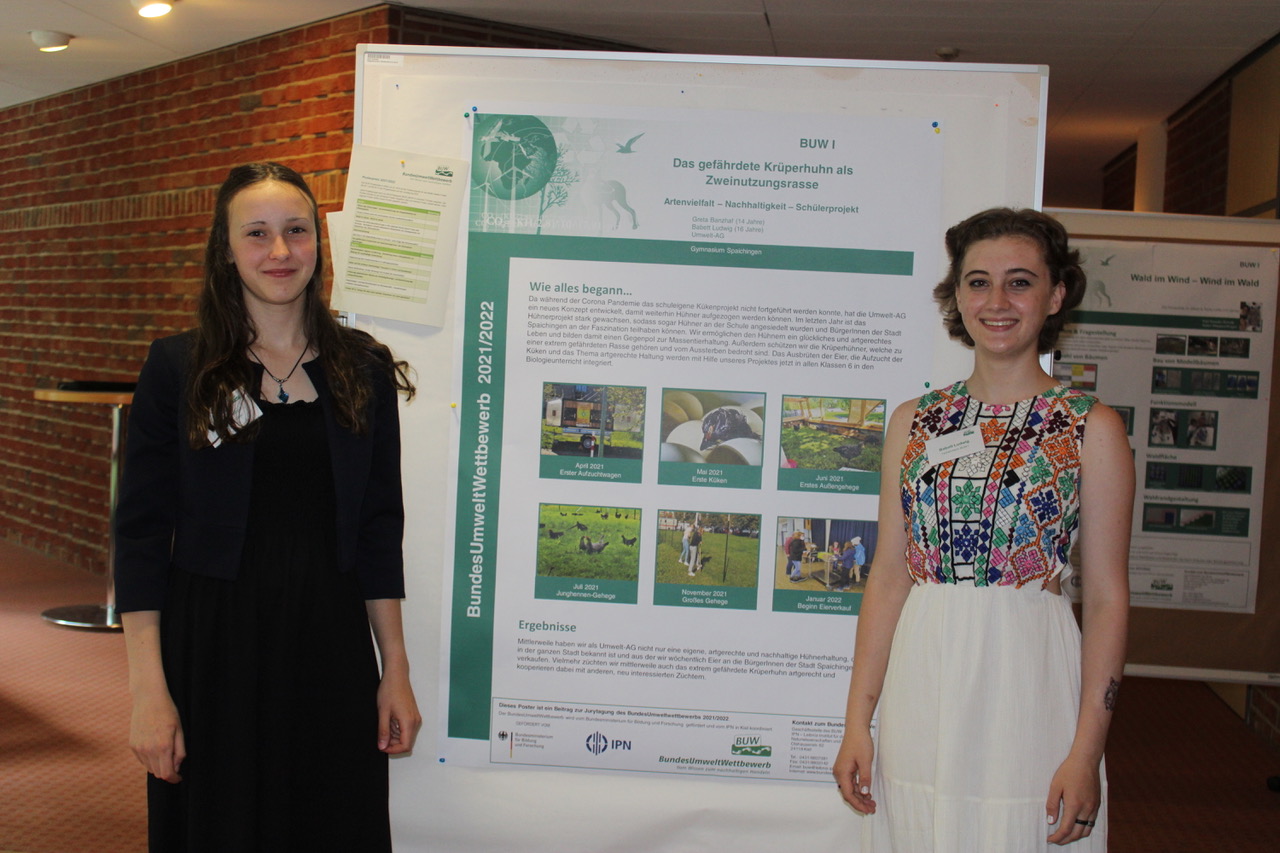 Babett Ludwig und Greta Banzhaf präsentierten in der Sparte BUW I einer vierzehnköpfigen, interdisziplinären Jury das Hühner-Projekt unter dem Titel „Das gefährdete Krüperhuhn als Zweinutzungsrasse am Gymnasium Spaichingen: Artenvielfalt – Nachhaltigkeit – Schülerprojekt“. Im Anschluss an ihren 15-minütigen Vortrag erfolgte ein umfangreiches Fachkolloquium über ihre Projektergebnisse.