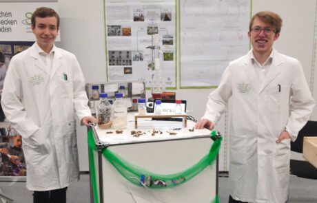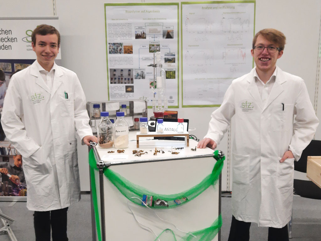 Das Forschungsprojekt „Biopolymers of the next generation“ von Nathanael Strom und Roland Grimm vom Gymnasium Spaichingen wurde in diesem Jahr von der internationalen Fachjury mit Gold ausgezeichnet. In ihrem Projekt haben die beiden Nachwuchsforscher die Entwicklung eines Biopolymers auf Algenbasis untersucht. Durch chemische Modifikation der Alginsäure, welche der Gerüstbaustein von Algen ist, konnten sie eine Molekülstruktur entwickeln, die die Herstellung von Kunststoffen auf Algenbasis ermöglicht. In einem Klick-System können nun verschiedene, weitere Molekülbausteine an diese Struktur angeknüpft werden, sodass individuelle Kunststoffe, je nach Anwendungsbedarf, synthetisiert werden können.