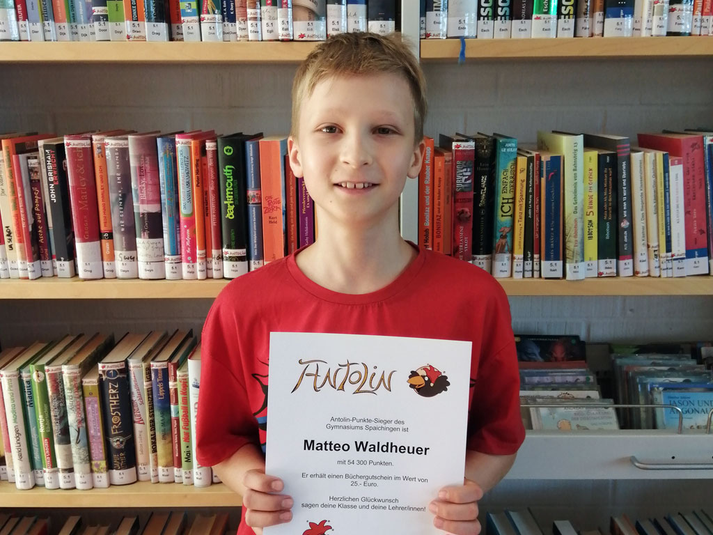 Matteo Waldheuer hat den Antolin-Lese-Preis im zu Ende gehenden Schuljahr gewonnen. Mit 54.300 Punkten hat der Fünftklässler einen neuen Schulrekord am Gymnasium Spaichingen aufgestellt und darf sich über einen Büchergutschein in Höhe von 25 Euro freuen.