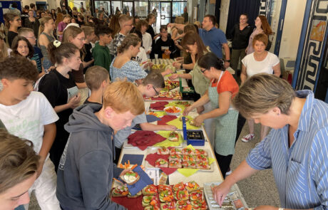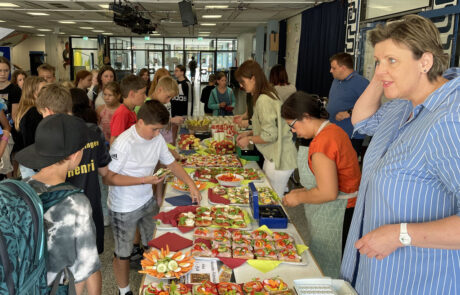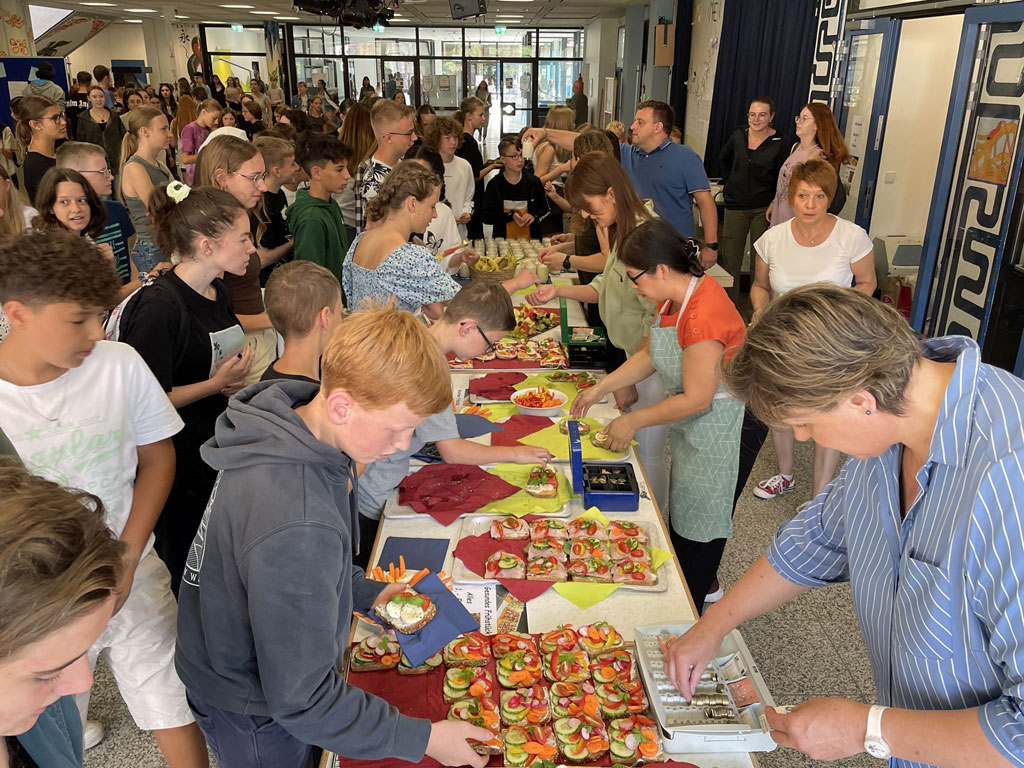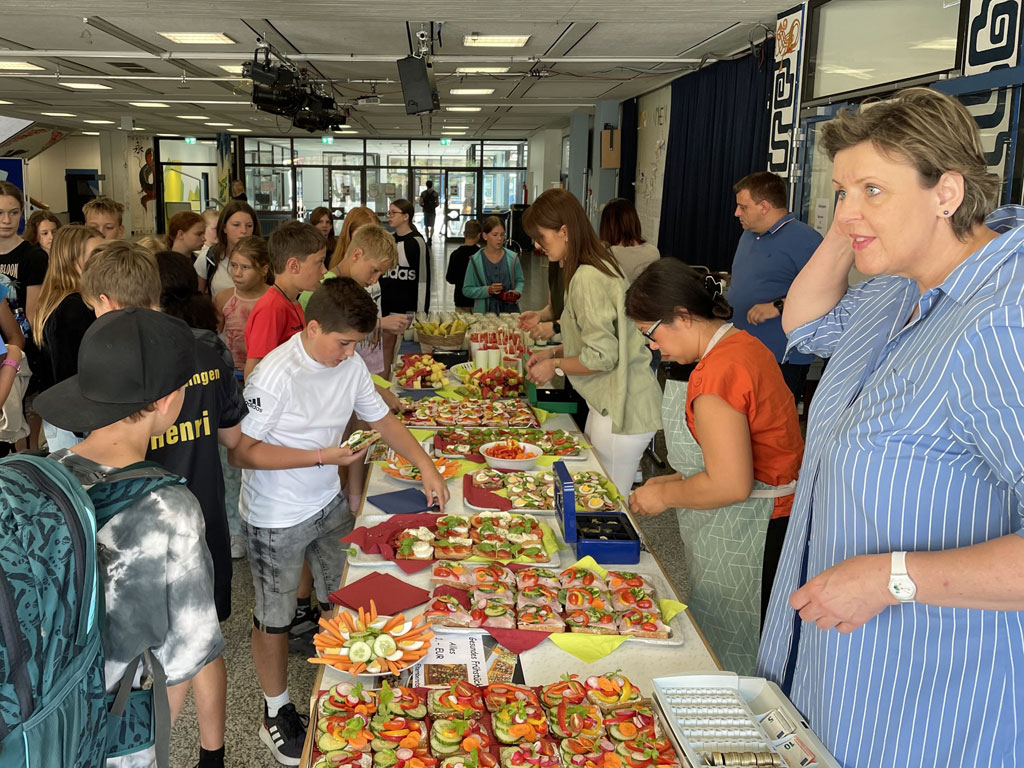 Das Buffet, das in der Aula aufgebaut war, erinnerte an einen festlichen Empfang. Die mit Käse, Schinken, Lachs, Gemüse oder Tomaten und Mozzarella belegten Vollkornbrote waren liebevoll und reichhaltig dekoriert. Dazu gab es Fruchtspieße und Milchshakes. Die Schülerinnen und Schülern griffen gerne zu, denn nicht nur das Angebot, auch der Preis konnte überzeugen: Brote, Shakes und Spieße gab es für nur einen Euro.