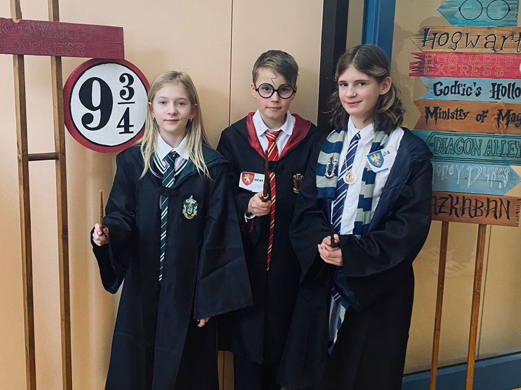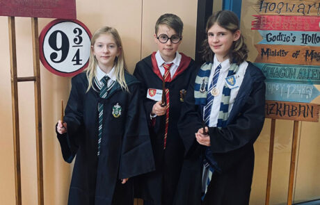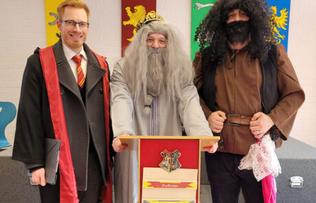 In der ersten Kompaktwoche wurden die Tore der Hogwarts Schule für Hexerei und Zauberei wieder geöffnet. Begrüßt wurden die Schüler der Klasse 5c, nachdem Sie ein paar Tage zuvor eine persönliche Einladung erhalten haben. Die teilweise passend zum Thema verkleideten Schüler trafen sich mit dem Wildhüter Hagrid in ihrem zur Winkelgasse umfunktionierten Klassenzimmer und wurden von den Vertrauensschülern mit dem Hogwartsexpress am Gleis 9 ¾ abgeholt. Als Räumlichkeit für diesen Anlass diente die Mediathek der Schule, die für diesen Tag umfunktioniert und dekoriert wurde. Die Schüler mussten ein Passwort nennen („Zitronensorbet“), damit sich die Tür mit der fetten Dame für sie öffnet. Sowohl diese Szene als auch viele andere wurden aus den Harry Potter Büchern entnommen, um den Tag so authentisch wie möglich zu gestalten. Nach dem die Schüler von Professor Mc Gonagall und Schulleiter Dumbledore herzlich zu diesem magischen Tag begrüßt wurden, haben die Vertrauensschüler einige bekannte Harry-Potter-Szenen in Form einer Lesung und Auszügen aus Hörbuch und Film vorgetragen. Danach fand die erste Pause für die Schüler statt. Alle durften sich auf das Buffet im Honigtopf freuen und von ihren selbstgemachten Leckereien nach dem Harry-Potter-Backbuch naschen.