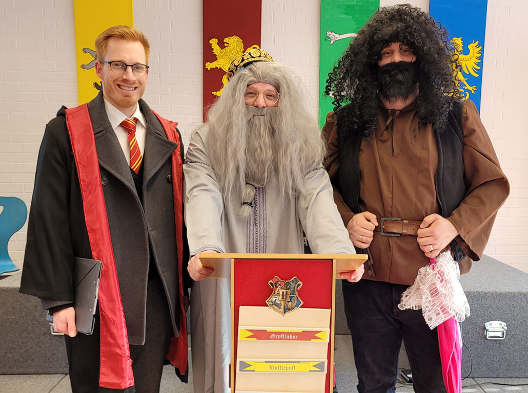 Im Anschluss fand die Häusereinteilung durch den sprechenden Hut statt. Jeder Schüler durfte den Hut aufsetzten und erfuhr dabei, in welches der vier bekannten Häuser Gryffindor, Hufflepuff, Ravenclaw und Slytherin er eingeteilt wurde. Bei allen Schülern war die Freude riesengroß. Um am Ende diesen Tages den Hauspokal zu gewinnen, mussten die Schüler durch verschiedene Leistungen Punkte für ihre Häuser sammeln. Nachdem die Lesespezialisten die ersten Punkte im Literatur-Quiz erhalten haben, durften sich die Schüler aufgrund ihrer besonderen Talente an diversen Stationen (Zauberschachturnier, Kräuterkunde u.v.m.) beweisen und weitere Punkte für ihr Haus erkämpfen. Nach der zweiten Stärkung im Honigtopf ging es zum Höhepunkt des Tages, dem Quidditchturnier. Hier mussten die Schüler auf dem Pausenhof bei dem sehr detailgetreuen Spiel gegeneinander antreten. Am Ende des Tages wurden alle Punkte zusammengezählt und die Platzierungen bei der feierlichen Pokalverleihung bekannt gegeben. Gewonnen hat das Haus Ravenclaw mit 146 Punkten. Somit ging ein besonderer und magischer Tag zu Ende und zauberte allen Schülern einen großes Lächeln ins Gesicht.