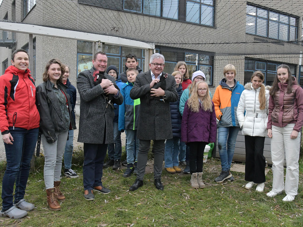 Die am Gymnasium Spaichingen gehaltene Rasse des Krüperhuhns steht auf der roten Liste der gefährdeten Arten, sodass auch hier ein Beitrag zum Artenschutz geleistet wird. Die Tiere sind robust, wetterfest und sehr zutraulich, was auch Herr Wolf und Herr Hugger feststellen durften.