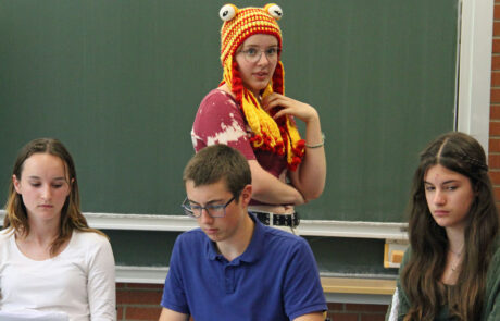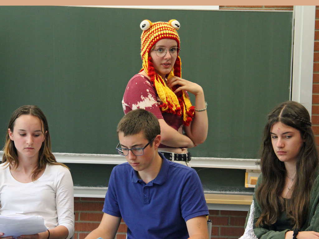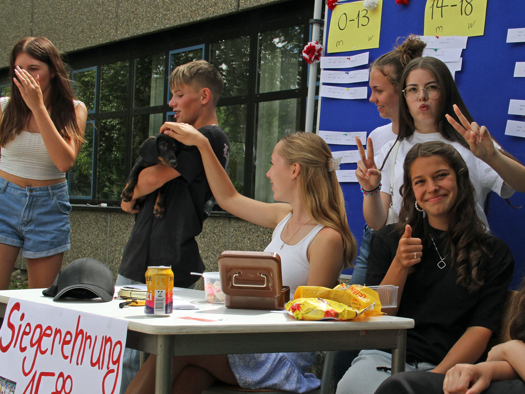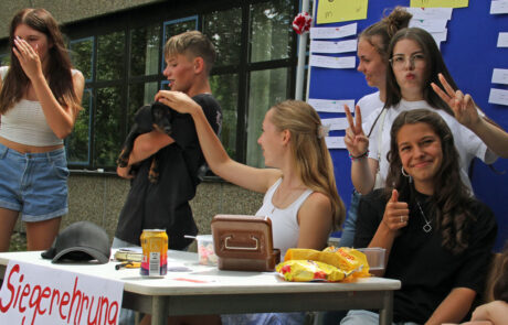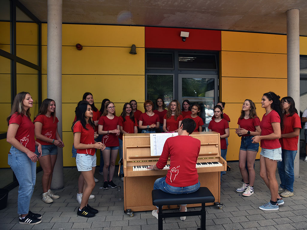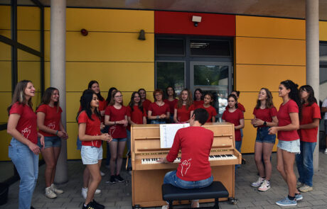 Am Schulfest präsentierten sich auch die Ensembles des Gymnasiums: Bigband und Chor traten auf, und die Theater-AG gab eine halbstündige Kostprobe ihres neuen Stücks „Emissionsrisiken“. Das ganze Stück ist dann im kommenden Herbst im Rahmen eines Theaterabends zu sehen.