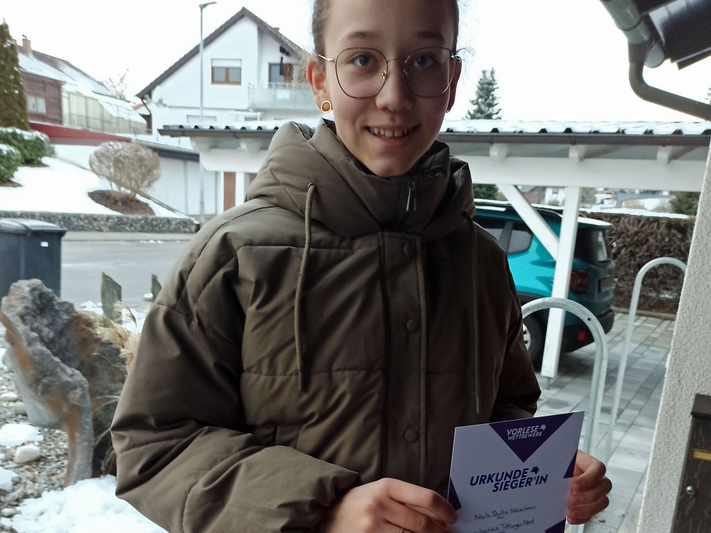 Dort durfte sie zunächst einen selbstgewählten und vorbereiteten Text präsentieren. Sie entschied sich, aus dem Krimi „T wie Tessa“ von Frauke Scheunemann vorzulesen. In der zweiten Runde kämpfte sie sich durch einen unbekannten Textausschnitt aus dem Buch „Der Junge, der mit den Wölfen spricht“. Und das sehr erfolgreich – durch ihren Vorsprung gegen acht weitere Teilnehmerinnen, qualifizierte sie sich zum Bezirksentscheid im März oder April und darf ihre Superkraft weiter der Öffentlichkeit zeigen.