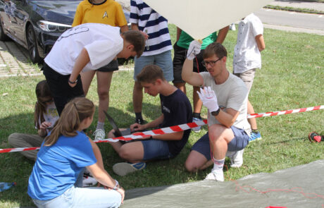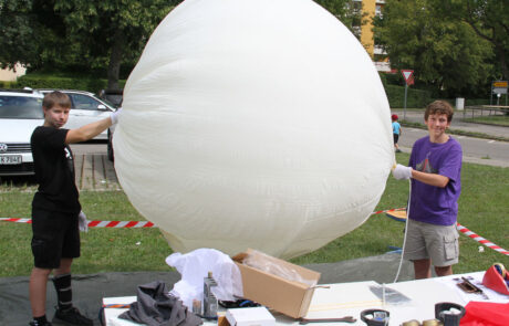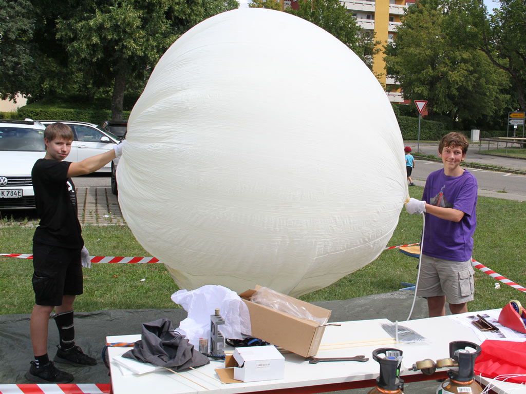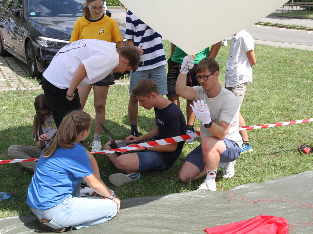 Und wie kommt so ein Wetterballon wieder auf die Erde zurück? Je höher der Ballon steigt, erklärte Lehrer Felix Rieber, umso geringer wird der Druck der Umgebungsluft. Die Latex-Hülle des Flugobjekts dehnt sich dabei immer weiter aus: von ursprünglich rund 2,5 Meter auf über fünf Meter. Schließlich platzt sie und die Styropor-Mess-Box segelt an einem kleinen Fallschirm Richtung Erde.