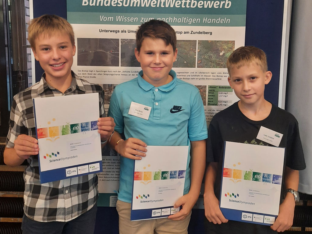 In der Kategorie BUW I wurden vom Gymnasium Spaichingen Luke Schöttle, Lukas Heinzler und Finn Barta für ihr Projekt „Unterwegs als Umweltdetektive: Das Biotop am Zundelberg“ mit dem Preis der Heinz Sielmann Stiftung, einem von vier Sonderpreisen des BUW I, ausgezeichnet. Fachkundig unterstützt durch Harald Niemann, die Stadt Spaichingen und die Feuerwehr Hausen o.V. hatten die drei Schüler das gefährdete Biotop am Zundelberg eigenständig analysiert und wieder zu einem Lebensraum ertüchtigt.