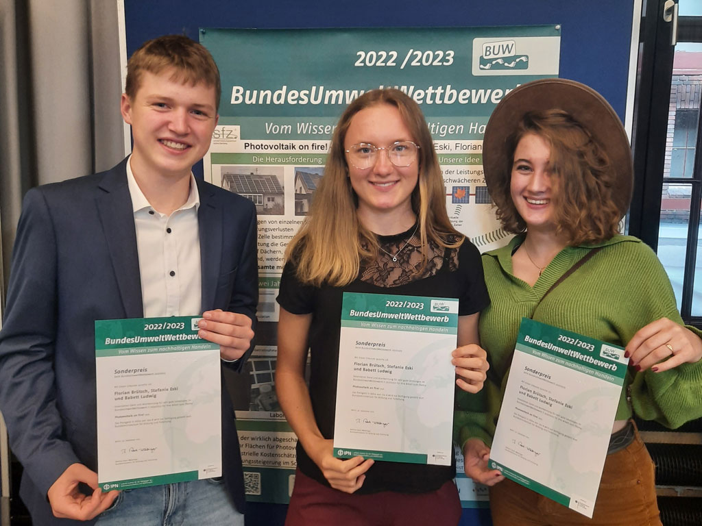 Bei den älteren Schülern des BUW II durften sich Babett Ludwig und Stefanie Eski vom Gymnasium Spaichingen gemeinsam mit Florian Brütsch (OHG Tuttlingen) über die Auszeichnung durch das Bundesministerium für Bildung und Forschung (BMBF) freuen. Ihr Projekt „Photovoltaik on fire!“, in dem sie eine Lösung zur Leistungssteigerung von Solaranalagen entwickelt haben, erhielt damit einen von sechs Sonderpreisen des BUW II.