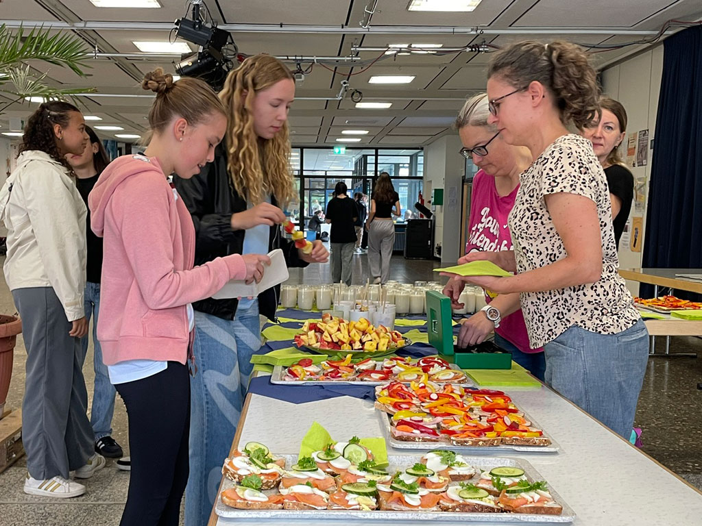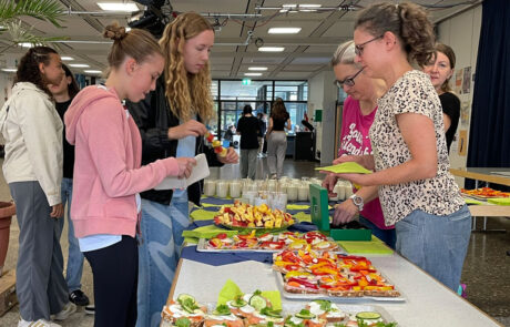 Ein gesundes Frühstück gab es am Freitag, den 12. Juli, in der ersten Pause am Gymnasium Spaichingen. Der Elternbeirat hatte sich wieder mächtig ins Zeug gelegt und ein Buffet mit Fruchtspießen, Bananenshakes sowie unterschiedlich und reichhaltig belegten Broten in der Aula angerichtet. Alles für jeweils nur einen Euro. Die Schülerinnen und Schüler griffen zu und ließen es sich schmecken.