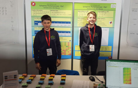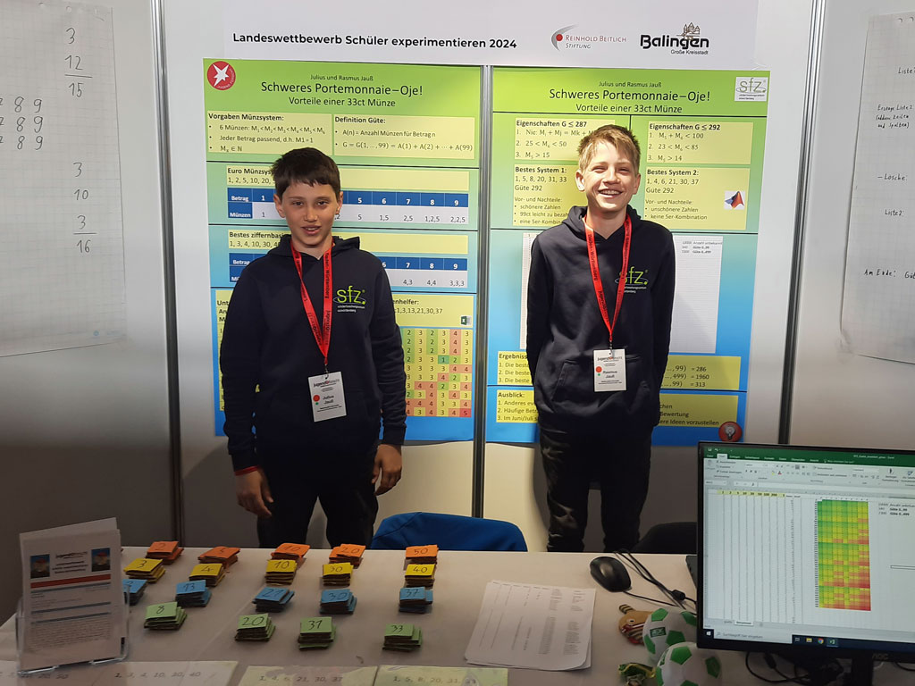 Über Platz 3 beim Landesfinale Schüler experimentieren in Balingen, freuten sich Julius und Rasmus Jauß (beide Klasse 7), die mit Ihren Untersuchungen und Forschungsergebnissen zur Güte von Münzsystemen die Jury im Fach Mathematik zu überzeugen wussten.