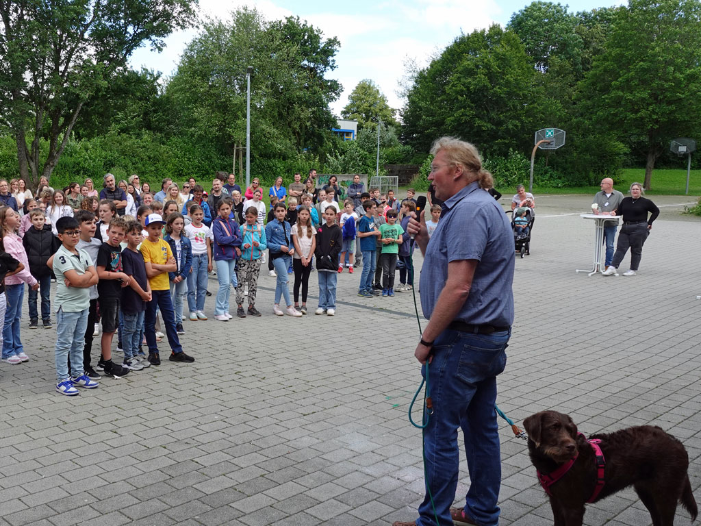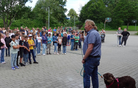 Schulleiter Jürgen Pach begrüßte die Gymnasiasten in spe gemeinsam mit Schulhund Bibi. Danach gingen die Mädchen und Jungs in ihre zukünftigen Klassen und lernten ihre Klassenlehrerteams, ihre Paten aus der siebten Klasse und natürlich auch ihre zukünftigen Klassenkameraden kennen.