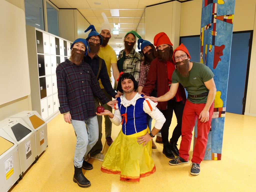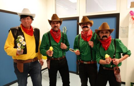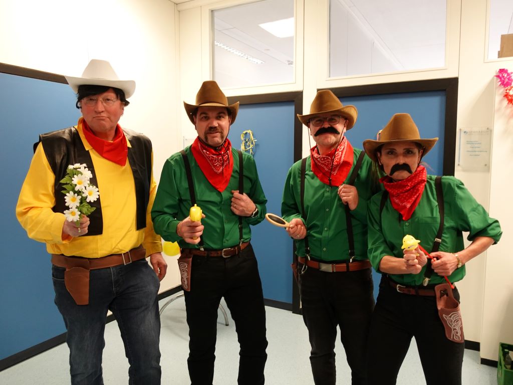 Auch die Schulleitung hatte sich etwas Besonderes einfallen lassen: Schulleiter Jürgen Pach erschein als Lucky Luke samt Schulhund Bibi als Rantanplan und die Abteilunsgleiter Alexandra Meier, Christian Jülg und Daniel Pulvermüller mimten passend dazu die Daltons. Schulsozialarbeiter Mustafa Morgil verwandelte sich in Schneewittchen mit sieben als Zwerge verkleideten Lehrerinnen und Lehrer im Schlepptau.