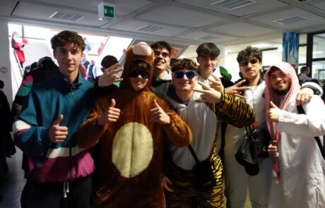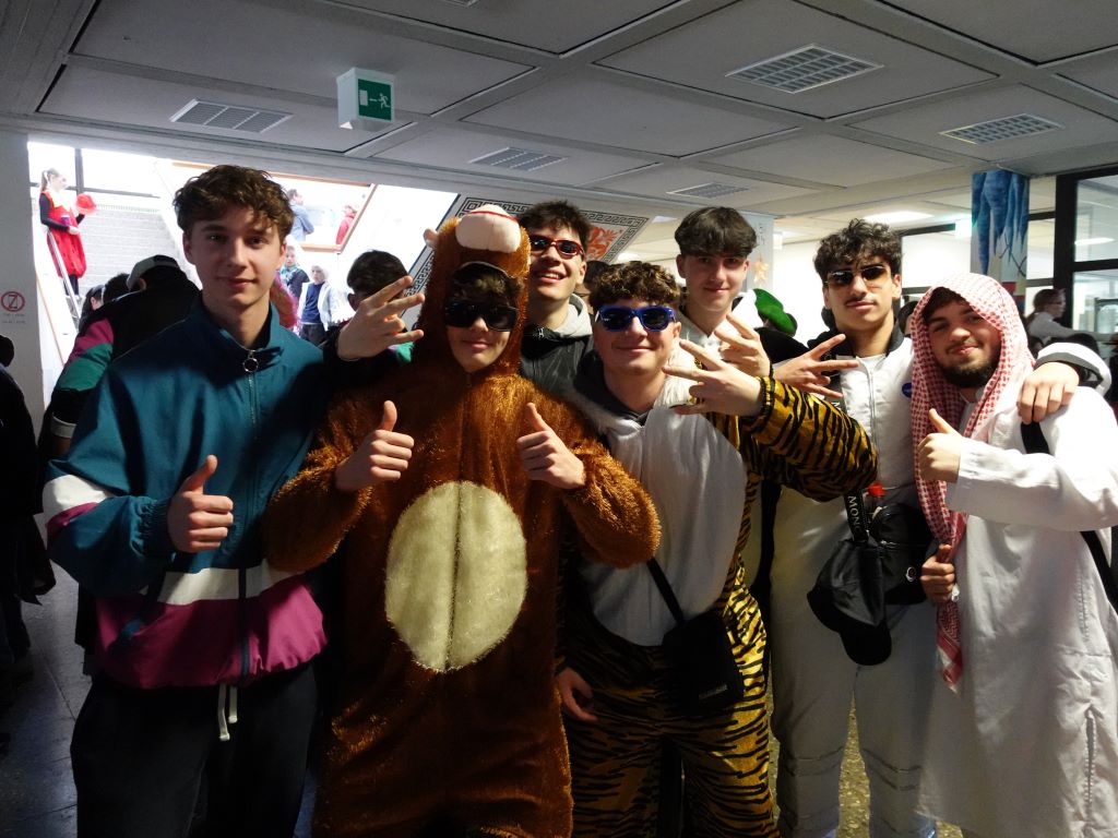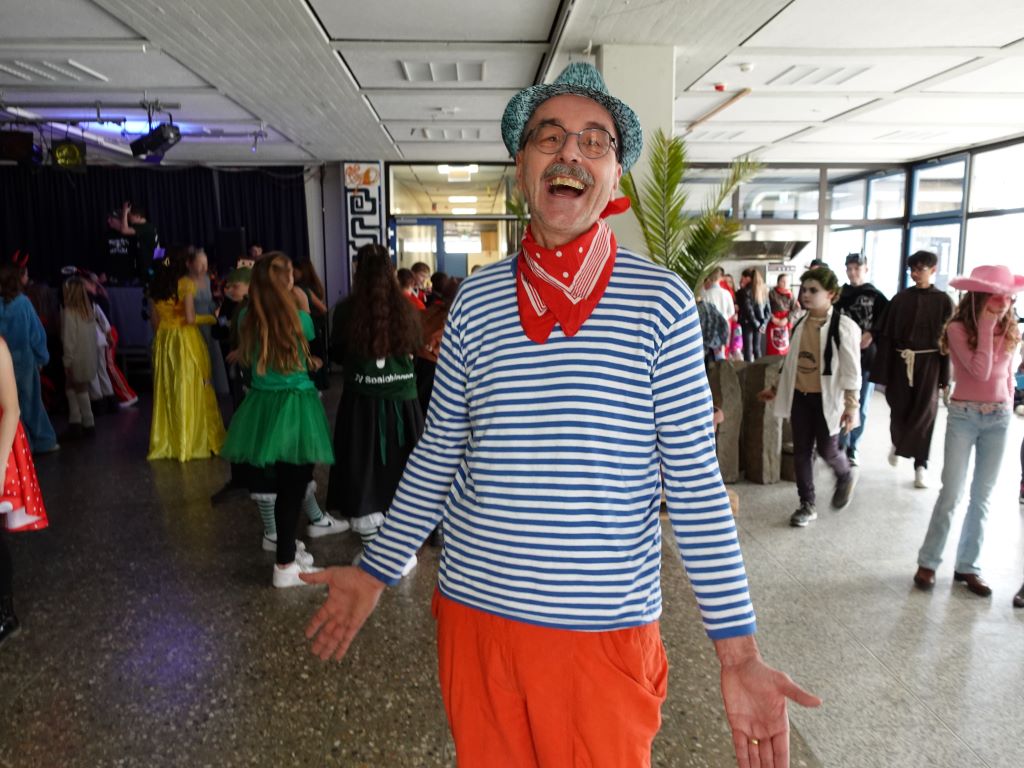 Zu Beginn der dritten Stunde schallten dann fette Beats durchs Schulhaus und die Schülermittverantwortung SMV lud zur Fasnachtsparty in die Aula. Ein Höhepunkt war die Prämierung der besten Fasnachtsverkleidung. Per Akklamation kürten die Schülerinnen und Schüler Latein- und Geschichtslehrer Bernhard Schäfer zum Sieger, der mit Ringelhemd und Glitzerhut für gute Stimmung sorgte.