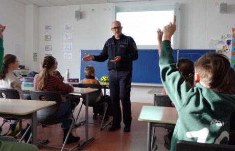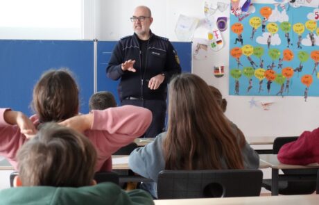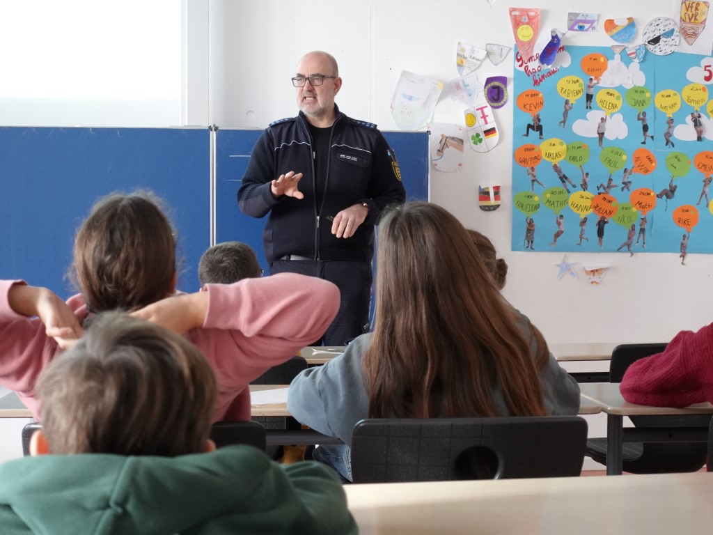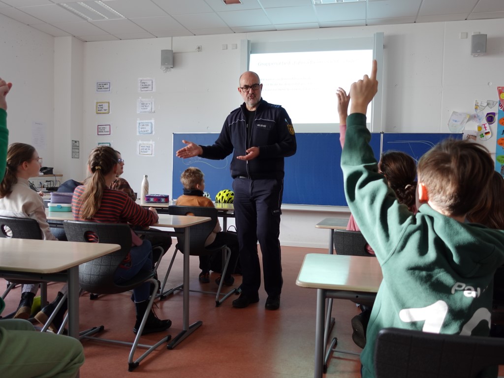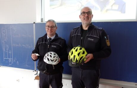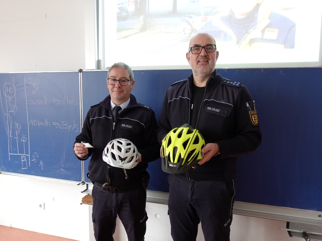 Mucksmäuschenstill war es im Klassenzimmer. Die Mädchen und Jungs hörten gespannt zu, was der große Mann in Polizeiuniform zu sagen hatte. Holger Jauch war mit seinem Kollegen Bernd Kohli ans Gymnasium Spaichingen gekommen, um den Fünftklässlerinnen und Fünftklässlern zu erklären, wie wichtig ein Fahrradhelm ist und dass er bei einem Unfall Gesundheit und Leben retten kann.