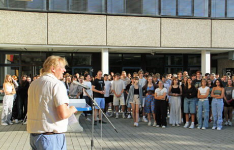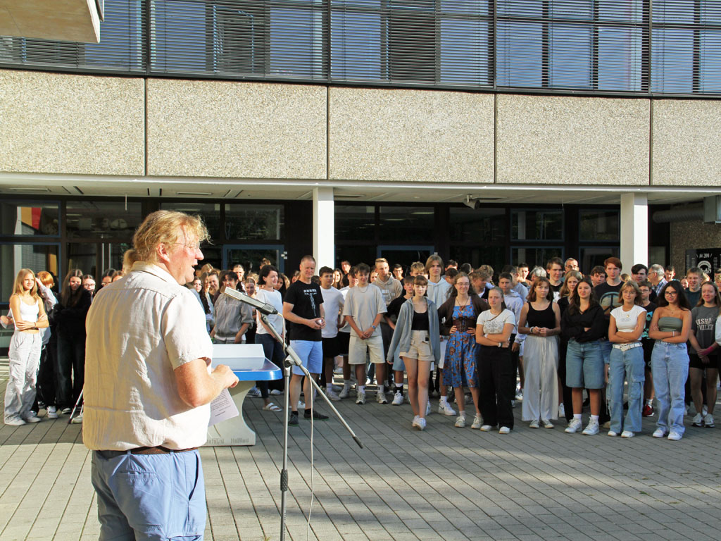 „Herzlich willkommen im neuen Schuljahr“, begrüßte Schulleiter Jürgen Pach die Kinder und Jugendlichen bei seiner Ansprache auf dem Schulhof. „Gefühlt verabschiede ich Euch in die Sommerferien“, sagte Pach im Blick auf das für September ungewöhnlich warme und sonnige Sommerwetter. Er wünschte den Schülerinnen und Schüler ein „tolles, lehrreiches, spannendes und kurzweiliges Schuljahr 2023/24“.