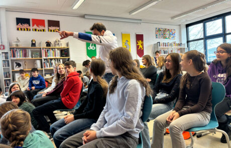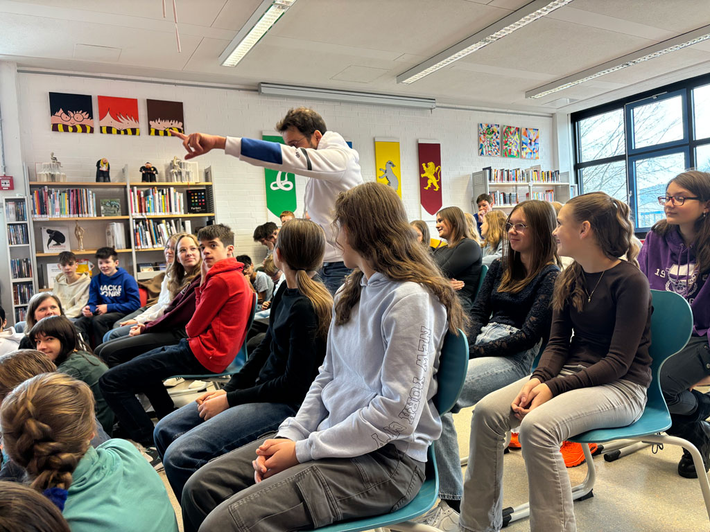 Habt ihr unsere Schülerinnen und Schüler schon mal so gebannt gesehen? Das interaktive Ein-Personen-Theaterstück „Ich bin nicht Siegfried“, welches die Nibelungensage in nur 45 Minuten erzählt, hat nicht nur die Siebt- und Achtklässler in den Bann gezogen, sondern auch die begleitenden Lehrpersonen. Tino Leo hat allen Beteiligten gezeigt, was ein Histotainer denn wirklich macht, denn dieses Theaterstück hat auf eine ganz besondere Art und Weise das Publikum verzaubert. Stellt euch vor, ein Mann steht vorne, doch durch das Verändern von Körperhaltungen und Stimme wechselt Tino Leo die 13 vorkommenden Rollen schlagartig. Unterstützung hat er lediglich durch sich selbst erhalten, indem er Umrisse und Charakterzüge der Protagonisten des Theaterstückes auf Plakate mit wenigen Strichen veranschaulicht hat.