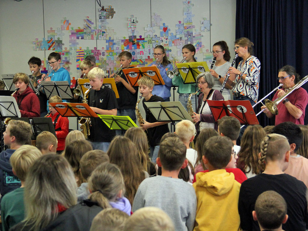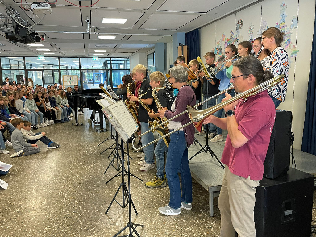 Zu Beginn der Feier hatte die Bigband des Gymnasiums unter der Leitung von Musiklehrerin Ute Aippersbach mit den Songs „Happy“ und „Peter Gun“ die Neuen und ihre Familien schwungvoll willkommen geheißen.