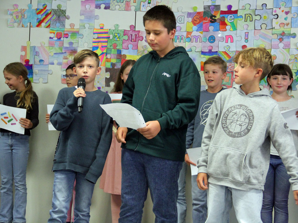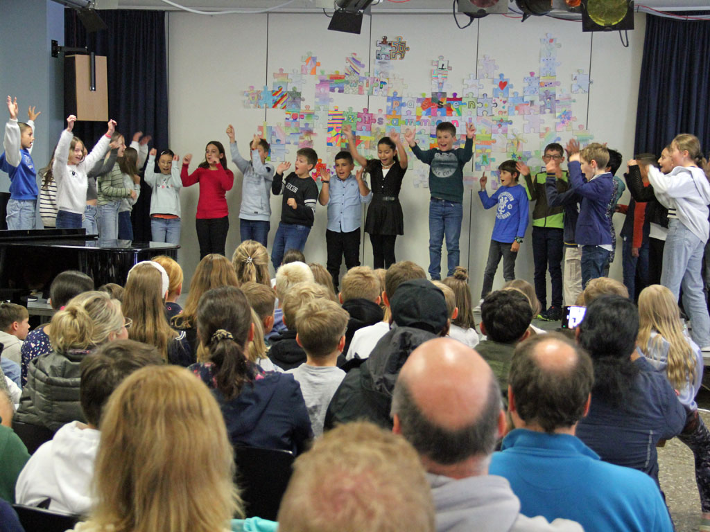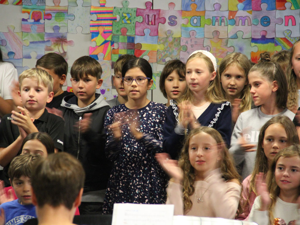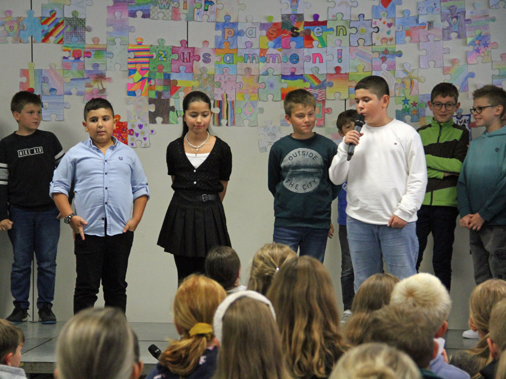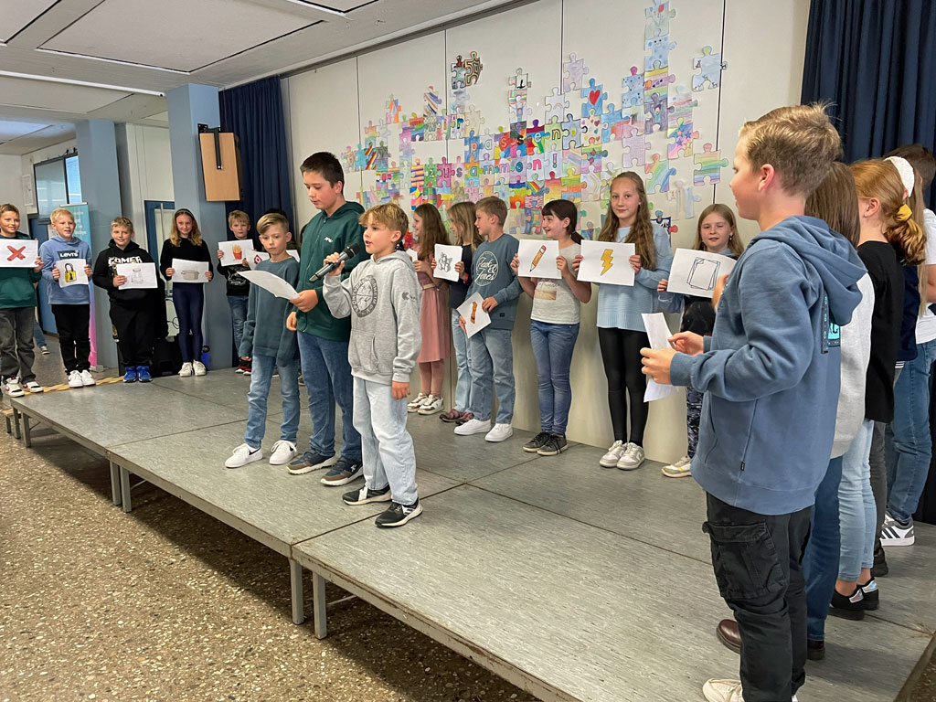 „Wir passen zusammen wie Pfeffer und Kreide“. Die 5c stiftete zunächst einige Verwirrung, indem die Schülerinnen und Schüler Wortpaare riefen, die überhaupt nicht zusammenpassten. Unter Einbeziehung des Publikums kamen die Begriffe dann aber doch noch zu ihrem passenden Gegenüber. So fand etwa der Pfeffer zum Salz, der Fisch zum Meer oder die Tafel zur Kreide. Am Ende rief die ganze Klasse. „Wir passen zusammen wie die Klasse 5c!“