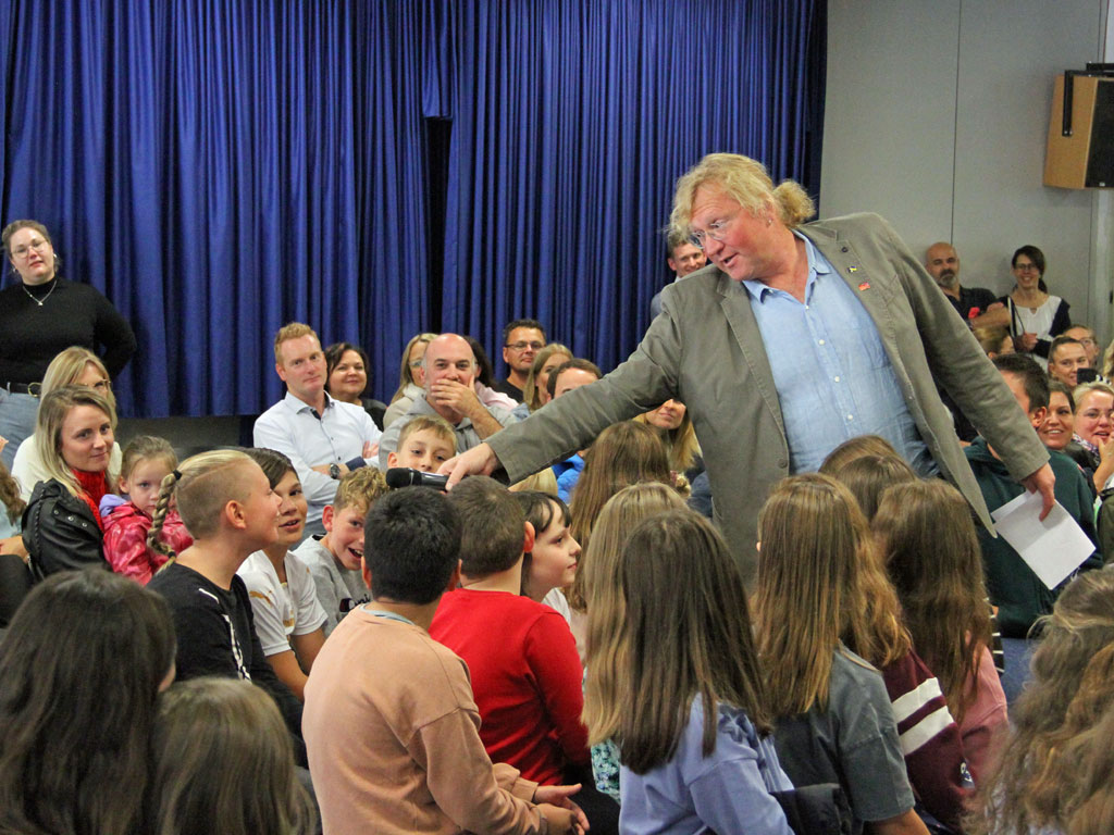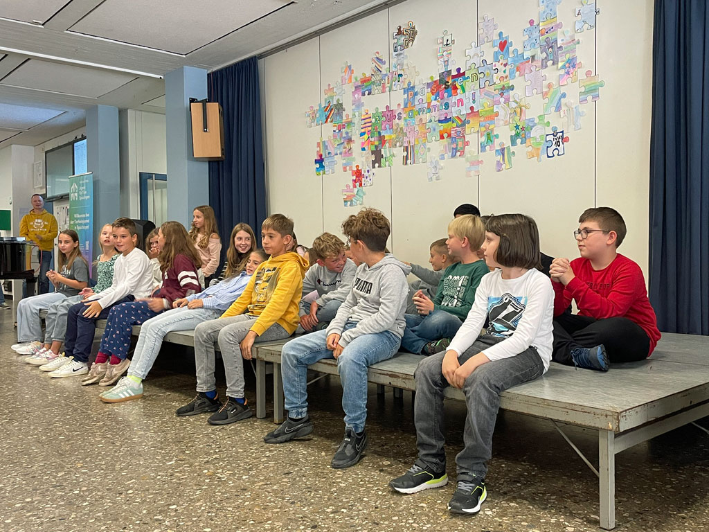 „Ich bin stolz, dass ihr bei uns auf der Schule seid“, freute sich Jürgen Pach in seiner Begrüßungsrede über die neuen Fünfer. Mit den Jungs und Mädchen seien 103 neue Teile zum Puzzle des Gymnasiums dazugekommen. Damit die Schulgemeinschaft ein „gut zusammenpassendes Puzzle“ werde und bleibe, sei es nötig, „dass wir jede und jeden so akzeptieren wie sie oder er ist, mit allen Stärken und Schwächen“, betonte der Schulleiter. Pach hatte den neuen Fünfern auch etwas mitgebracht: Die Jungs und Mädchen durften sich je einen Schokoriegel aussuchen, allerdings mit der Auflage, die Mitschüler und Mitschülerinnen, die die gleiche Sorte gewählt hatten, am Montag mit Handschlag zu begrüßen.
