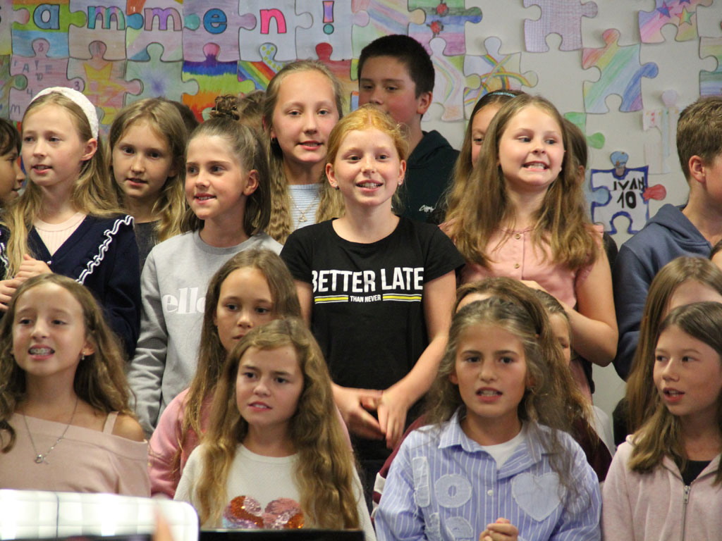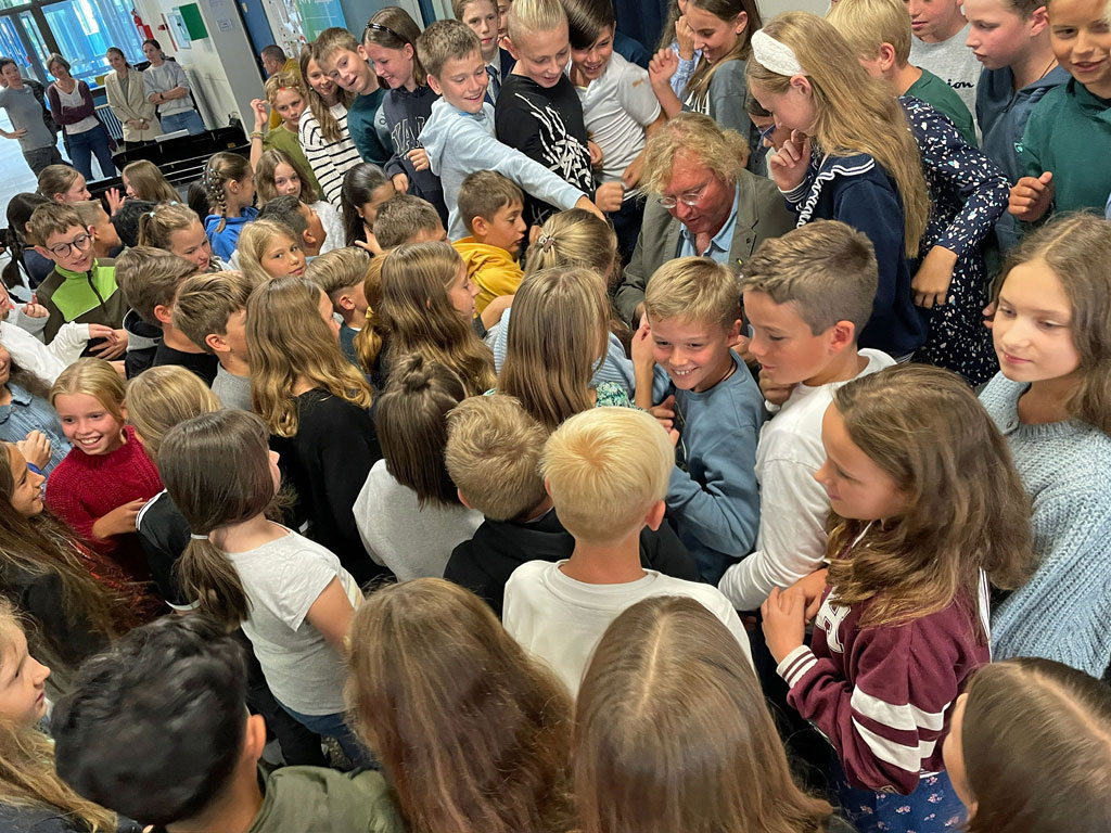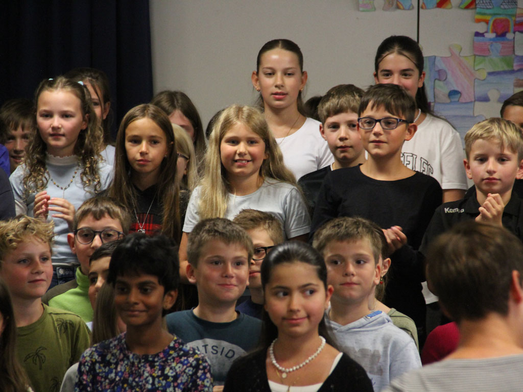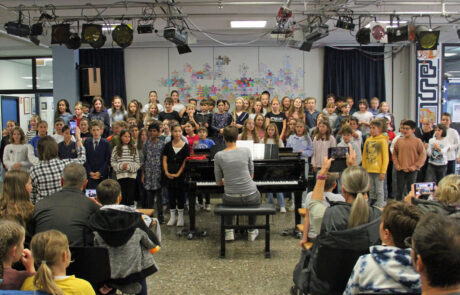 Zum Finale ihrer Aufnahmefeier fügten sich die fünften Klassen dann zu einer großen Gemeinschaft zusammen. Unter der Leitung von Musiklehrerin Miriam Wolff sangen alle neuen Fünfer gemeinsam: „Jetzt geht’s los!“