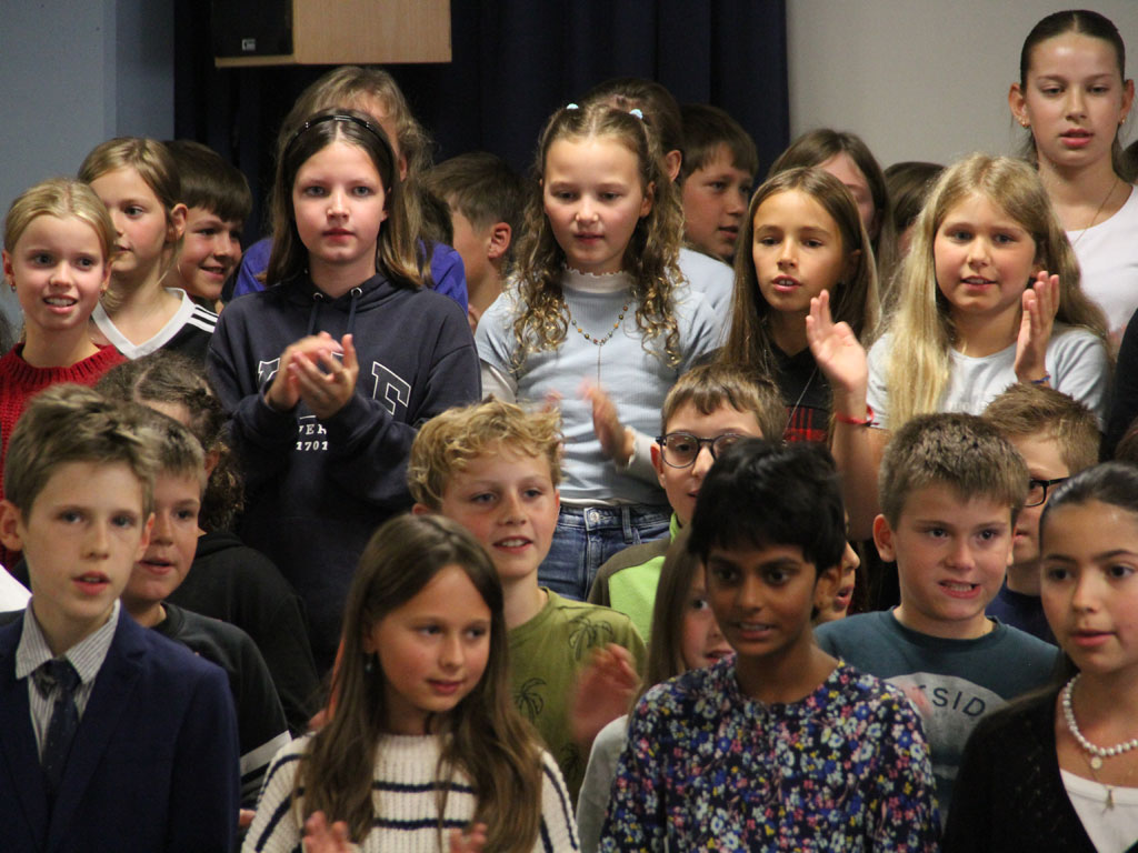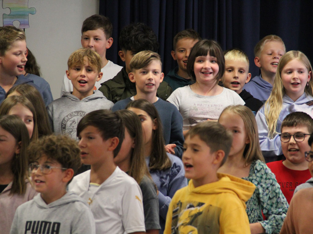 Danach waren die Fünfklässler selbst an der Reihe: Dass sie bereits ganz gut Englisch können, zeigten die Schülerinnen und Schüler der Klasse 5a in kurzen englischen Dialogen. Alle gemeinsam sangen: „If you‘re happy because you‘re 5a clap your hands!”