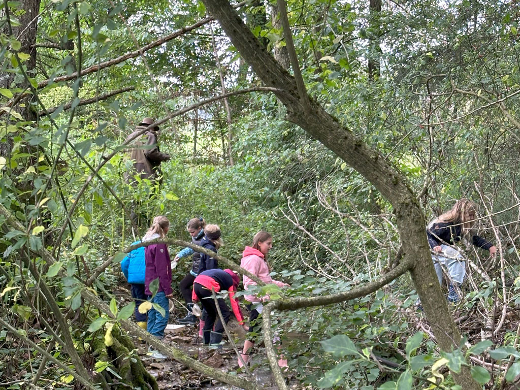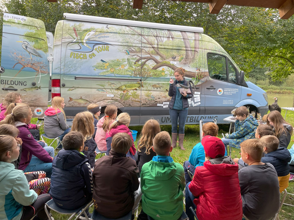 Was krabbelt, schwimmt und kreucht denn da? Anfang Oktober haben die Schüler und Schülerinnen der Klasse 6d vom Gymnasium Spaichingen genau dies erforscht. Das bestens ausgestattete Fischmobil des Landesfischereiverbands kam an den Riedbachweiher, der vom Angelverein Denkingen freundlicherweise für diese Veranstaltung zur Verfügung gestellt wurde. Nachdem die Biologin Ingabritta Hormann die Vielfalt und Abhängigkeit der Lebewesen untereinander erklärt hatte, durften die Jungforscher losziehen und buchstäblich im Schlamm wühlen.