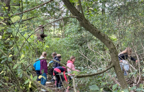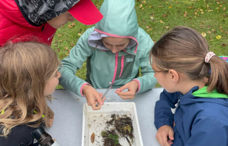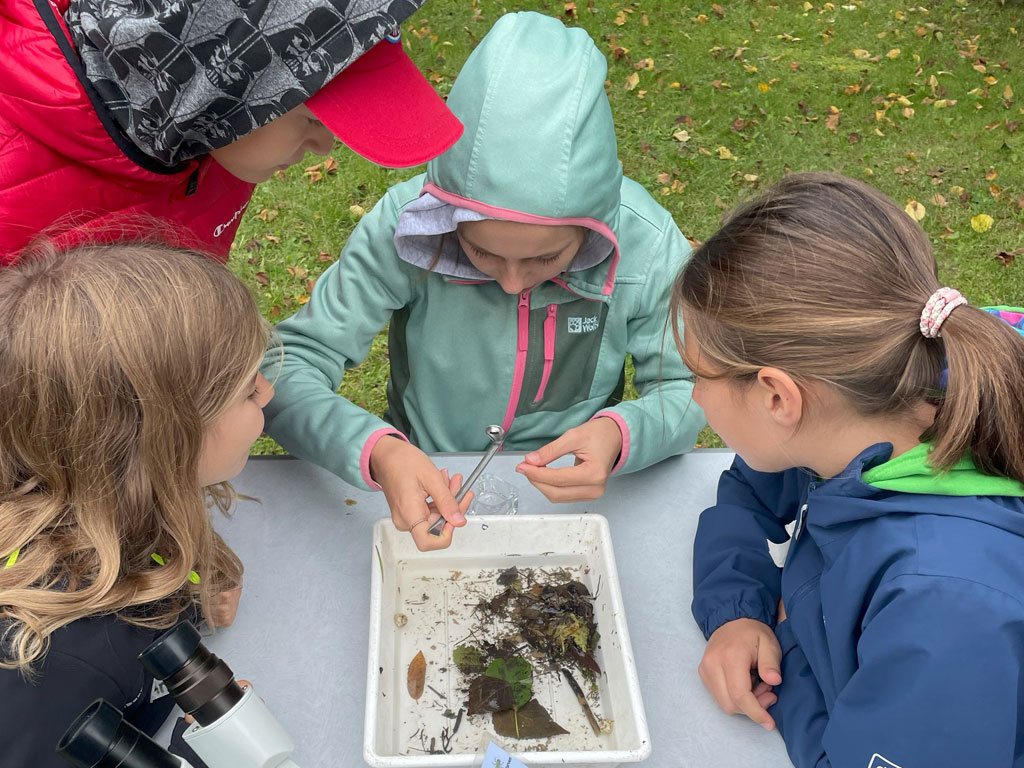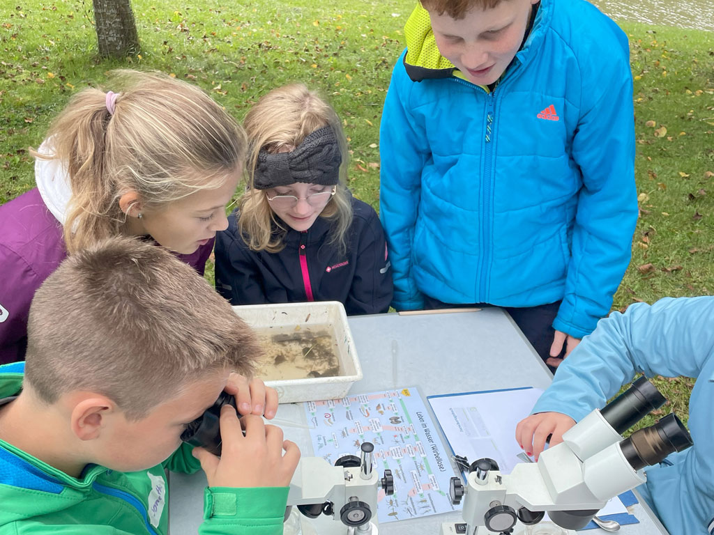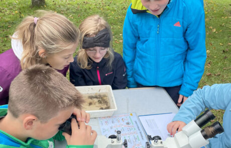 Nach der Feldarbeit kam die Laborarbeit mit Hilfe von Stereolupen, Forscherbüchern und Beobachtungsaufgaben. Hier wurde herausgefunden, welche Kleinstlebewesen im Arbach gefunden wurden und wer eigentlich wen frisst. Auf diese Weise wurden die Kinder mit allen Sinnen an die fragilen Zusammenhänge innerhalb dieses kleinen Ökosystems herangeführt.