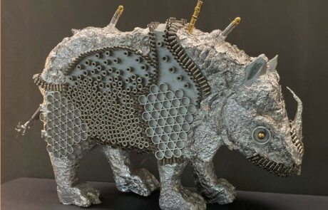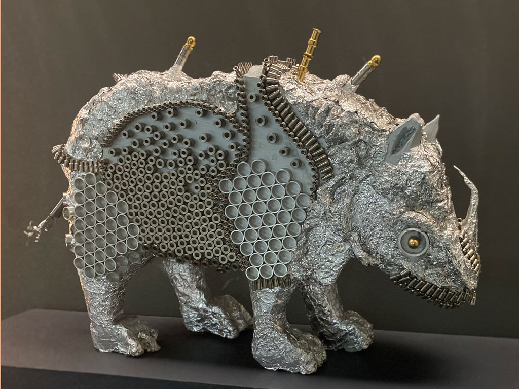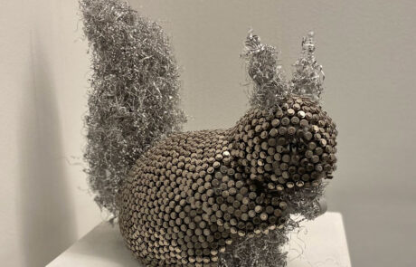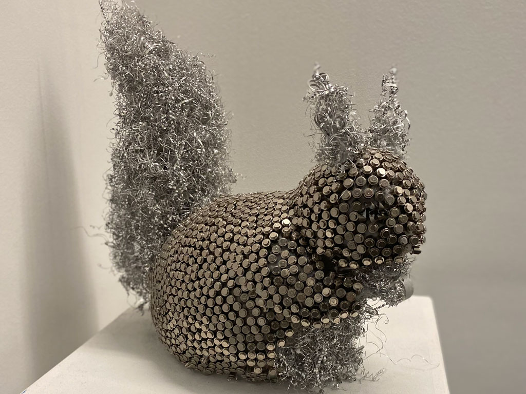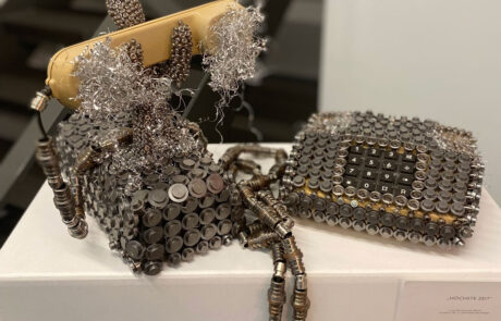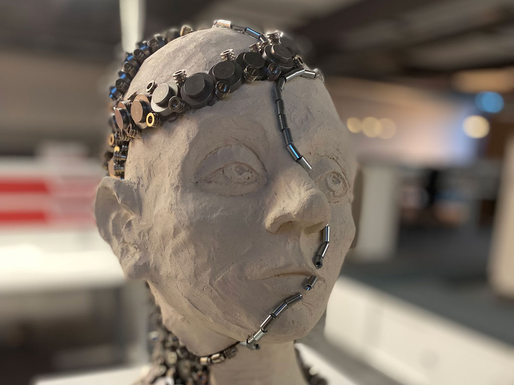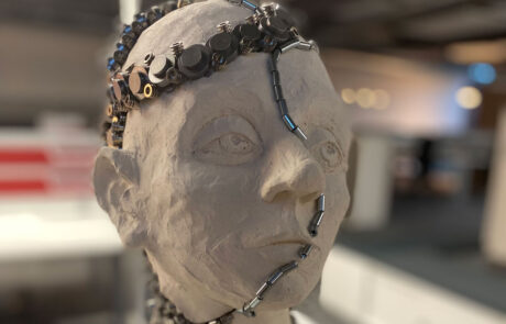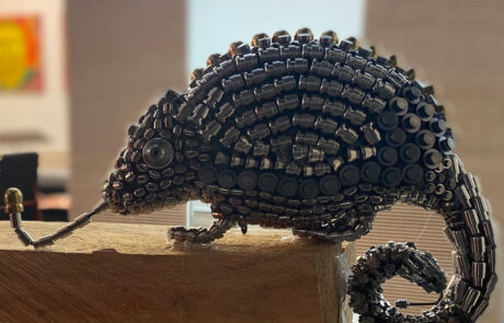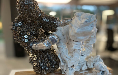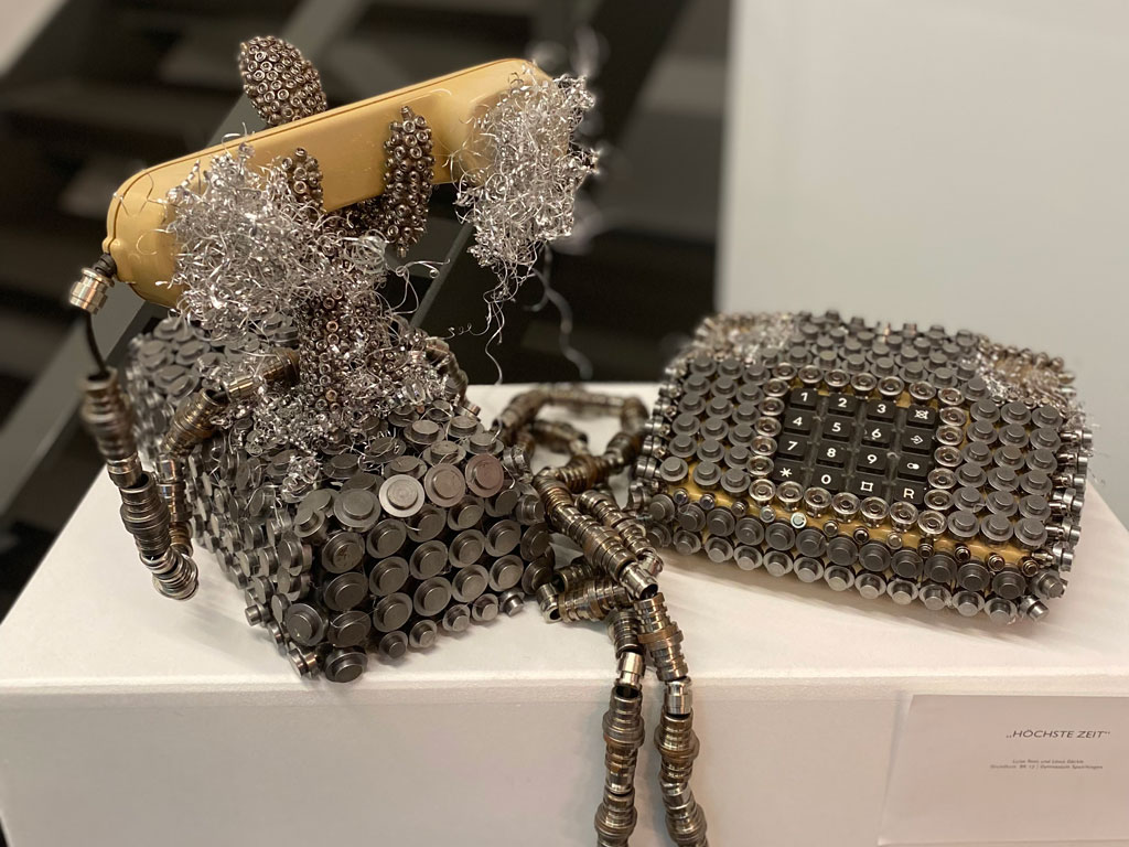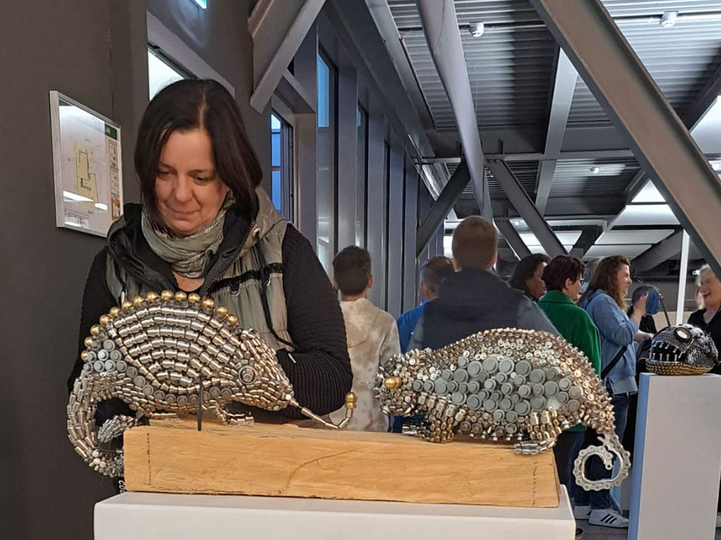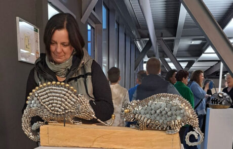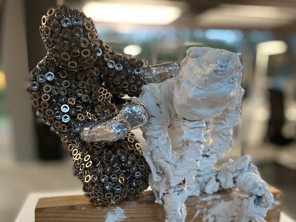 Für eine Überraschung sorgte die wertschätzende und ideenreiche Ausstellungsweise bei der Art Night, wo aus Schülerarbeiten richtige Kunstwerke wurden: zwei Chamäleons, deren Haut die Farbe und Struktur des Metalls annimmt, eine Tonbüste, die von Metallschmuck durchdrungen wird und die wie ein Cyborg wirkt, ein Torso, aus dessen aufgerissenen Leib ein Fluss aus Drehteilen fließt, eine sich zuwendende Figur aus Drehteilen, die eine andere aus Gips tröstet, ein schwebender Schmetterling aus schwerem Metall, der in einer Gitterbox gefangen wirkt. Vielfältige Werke waren zu entdecken.