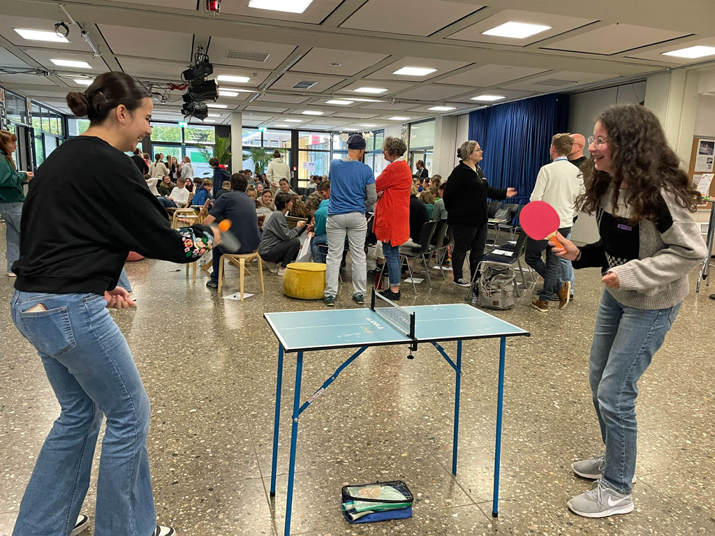 „Was ist denn hier los?“, dachte so mancher, der am 8. Oktober das Gymnasium Spaichingen betrat. Im Foyer standen Liegestühle und Sitzkissen. Zwei Tischtennisplatten luden zu einem Spielchen ein. Eine Süßigkeiten-Bar lockte mit Leckereien. Kaffee, Butterbrezeln und Hefezopf boten Gelegenheit zum zweiten Frühstück. Aufgebaut hatte das alles das Team Demokratiebildung vom Zentrum für Schulqualität und Lehrerbildung (ZSL) Baden-Württemberg. Ziel: eine Atmosphäre, in der Lehrer und Schüler entspannt, frei und kreativ darüber nachdenken können, was für eine Schule sie in Zukunft haben möchte