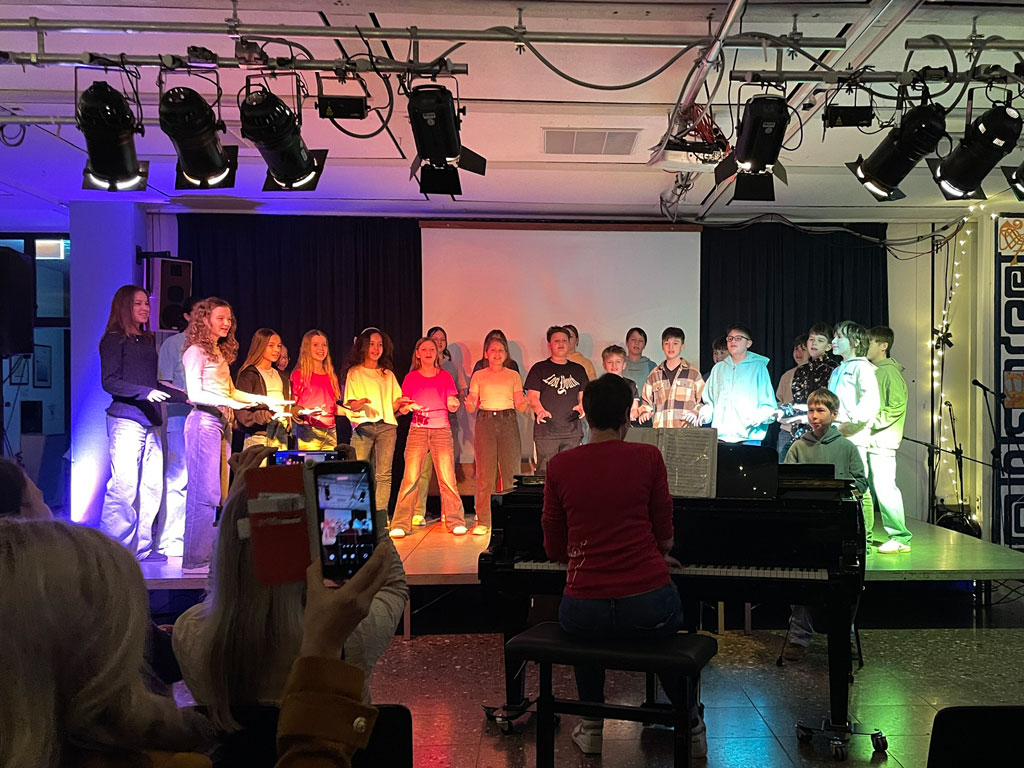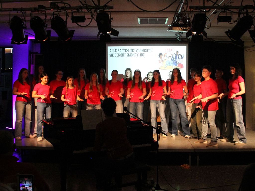 Aus mathematischen Höhen führte der Schulchor unter Leitung von Miriam Wolff das Publikum dann mit zwei Liedern zuerst hinunter in „Smokey Joe’s Café“ und dann mit „Heaven help us all“ in den Himmel zu Gott, den Stevie Wonder in seinem Gospelsong um Hilfe für eine ungerechte und geplagte Welt bittet.