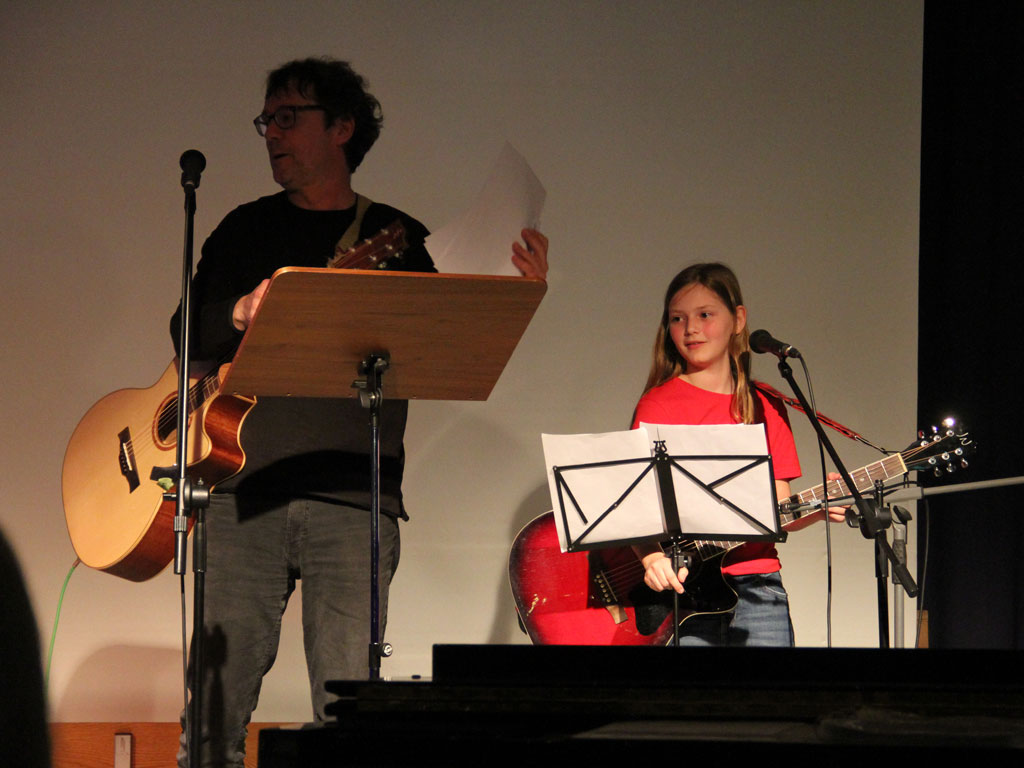 Ab ins Weltall ging es mit Lehrer Hartmut Maurer und Sophie Kratt aus der 6b, die als Gesangs- und Gitarrenduo David Bowies „A Space Oddity“ und „Major Tom“ von Peter Schilling, der sich von Bowies Song hatte inspirieren lassen, vortrugen.