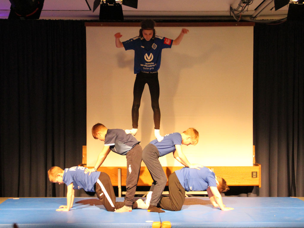 Fremde Konstruktionen baute die Klasse 5c, und zwar mit den eigenen Körpern. Bei ihrer Akrobatikvorführung stapelten sich die Schülerinnen und Schüler aufeinander, standen einander auf den Schultern, stemmten ihre Klassenkameraden in die Luft und verbanden sich zu immer neuen Figuren.