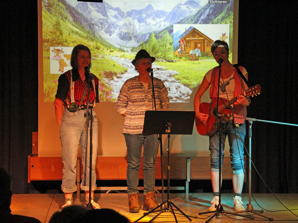 Unter dem Pseudonym „Die Drei von der Alm“ betraten die Musiklehrerinnen Ute Aipperbach, Margret Fuhrmann und Miriam Wolff die Bühne und gaben alpin gekleidet das Lied „Von der Schwoag bis auf d’Hochalm“ zum Besten. Dass es sich bei dem alpenländischen Volkslied um eine ganz fremde Welt handelte, zeigten Wörter wie „Kuahlanschen“, „Almbleamerln“ und „Habanspitz“, die das Publikum ratlos und gleichermaßen amüsiert zurückließen.