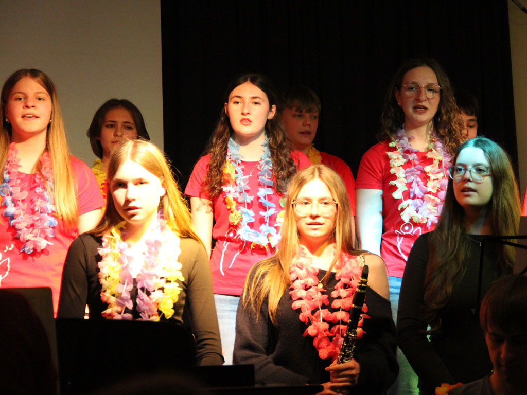 Zum Finale des Abends verstärkte der Grundkurs Musik den Schulchor mit weiteren Stimmen und allerlei Schlag- und Blasinstrumenten. Mit Blumenketten umkränzt sangen die Schülerinnen und Schüler zum Abschluss die inoffizielle Nationalhymne Haitis „Haiti Cheri“.