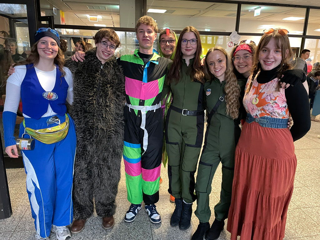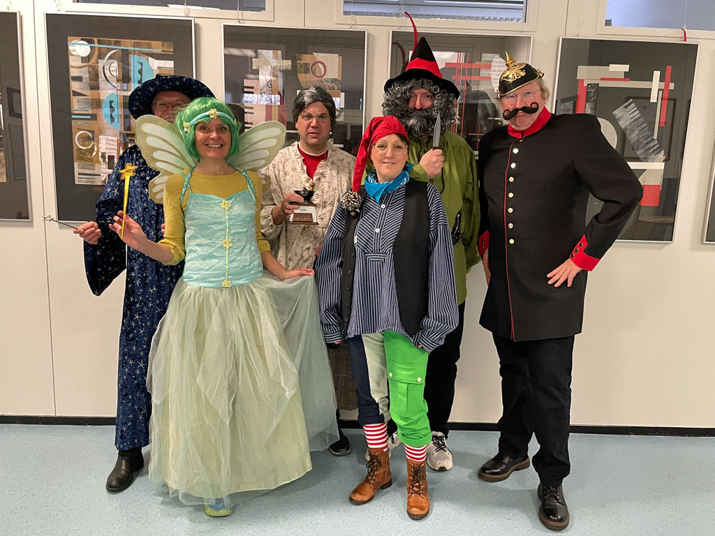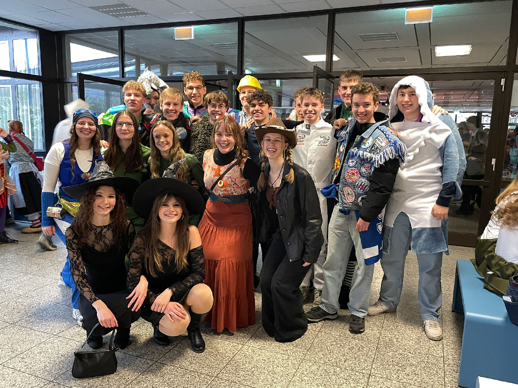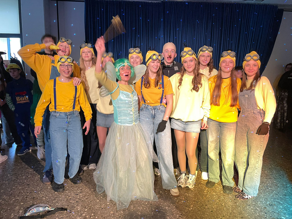 Bei lauter Musik und bunter Beleuchtung konnte man originelle Kostüme bestaunen. Neben den Schülerinnen und Schülern hatten sich auch viele Lehrkräfte verkleidet. So gab das Schulleitungsteam des Gymnasiums die Protagonisten aus Otfried Preußlers Räuber Hotzenplotz, mit Jürgen Pach als Wachtmeister Dimpfelmoser. Dass einige Schüler ihren Schulleiter mit Uniform und Pickelhaube für Otto von Bismarck hielten, spricht für den Geschichtsunterricht am Gymnasium.